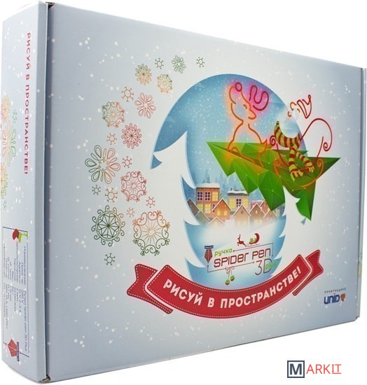 | Комплектация | - 3D ручка Spider Pen PLUS;- Книга трафаретов с новогодней тематикой;- 10 цветов пластика PLA (в том числе, светящийся в темноте);- Адаптер питания;- Подарочная красочная упаковка;- Инструкция. |