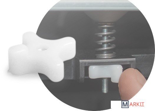Принтер оснащен интуитивно понятной системой калибровки с использованием специальных рукояток и программы слежения, которая указывает направление, в котором следует вращать рукоятки для достижения оптимального положения. Область печати составляет 200х200х200 мм. Принтер оснащен подогреваемой платформой и позволяет использовать для печати ABS и PLA-пластики от сторонних производителей.Опционально - лазерный модуль для гравировки.