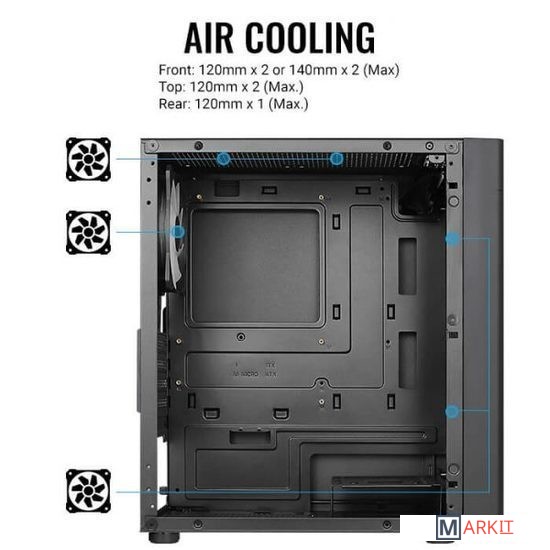 Этот высокопроизводительный корпус формата Mini-Tower создан с учетом вентиляции и предоставляет качественный воздушный поток, пока вы наслаждаетесь подсветкой вентиляторов на передней панели. Боковая панель из закалённого стекла позволяет рассмотреть все компоненты системы. Поддерживает установку системы жидкостного охлаждения в передней и задней части корпуса для увеличения эффективности охлаждения.Передняя панель с вентиляционными отверстиями увеличивают поток воздуха и улучшают вентиляцию, обеспечивая возможность видеть передние вентиляторы с подсветкойОборудован боковой панелью, полностью выполненной из закаленного стекла, для демонстрации внутренностей системыПоддерживает использование жидкостного охлаждения в передней и задней части корпусаПоддерживает установку вентиляторов на верхней, передней и задней панеляхПоддержка процессорных кулеров высотой до 159 ммПоддержка видеокарт премиум-класса длиной до 296 мм (без переднего радиатора)