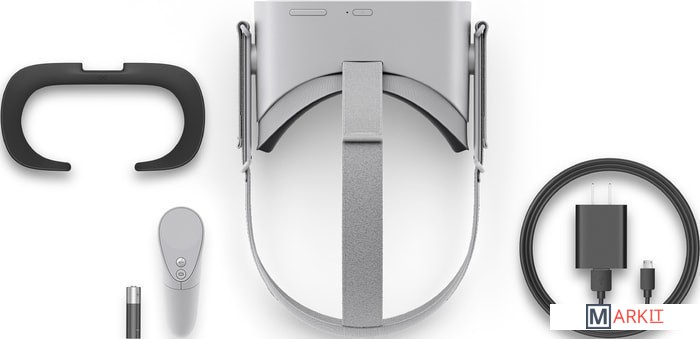 Игровая VR-гарнитура, не требующая подключения к ПК или игровой приставке. Внутри очков установлен 4-ядерный процессор Qualcomm Snapdragon 821. CPU на архитектуре Kryo с частотой до 2.4 ГГц. SoC производится по 14-нм техпроцессу. Объем встроенной памяти составляет 64ГБ.На корпусе расположены две кнопки управления: вкл/выкл и кнопка управления громкостью встроенных динамиков. Присутствует и светодиодный индикатор показывающий статус работы и остаток зарядка аккумулятора. Также предусмотрен разъем для подключения наушников со штекером 3.5 мм и порт microUSB - для зарядки самих очков.Игры доступны в библиотеке Oculus Store, а настройка очков производится при помощи приложения для смартфона. Зарядка очков занимает 3 часа. Кроме того, поддерживается ускоренная зарядка с соответствующим блокам питания.