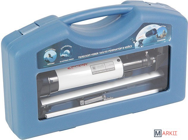 Его можно использовать и днем и ночью. Днем - как обычную подзорную трубу, а ночью, естественно, по прямому назначению. Телескоп дает прямое (не перевернутое) изображение.В него можно увидеть лунные кратеры диаметром больше 10 км, Марс, Сатурн и фазы Венеры. С помощью сменных окуляров (в комплекте 2 шт.), можно получить увеличение от 18х до 90х. Окулярная часть с 90° зеркалом позволяет удобно вести наблюдение, разместив прибор просто на столе (высота штатива 360 мм). Наблюдения днем лучше вести при увеличении 18х (с окуляром 20 мм), тогда ближняя точка фокусировки будет около 5 метров.